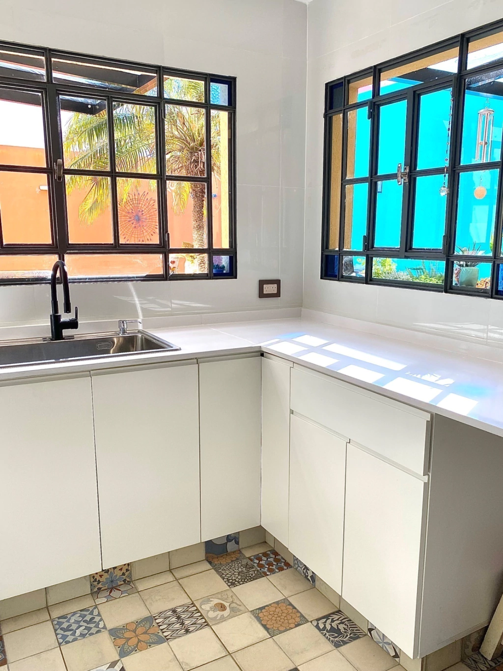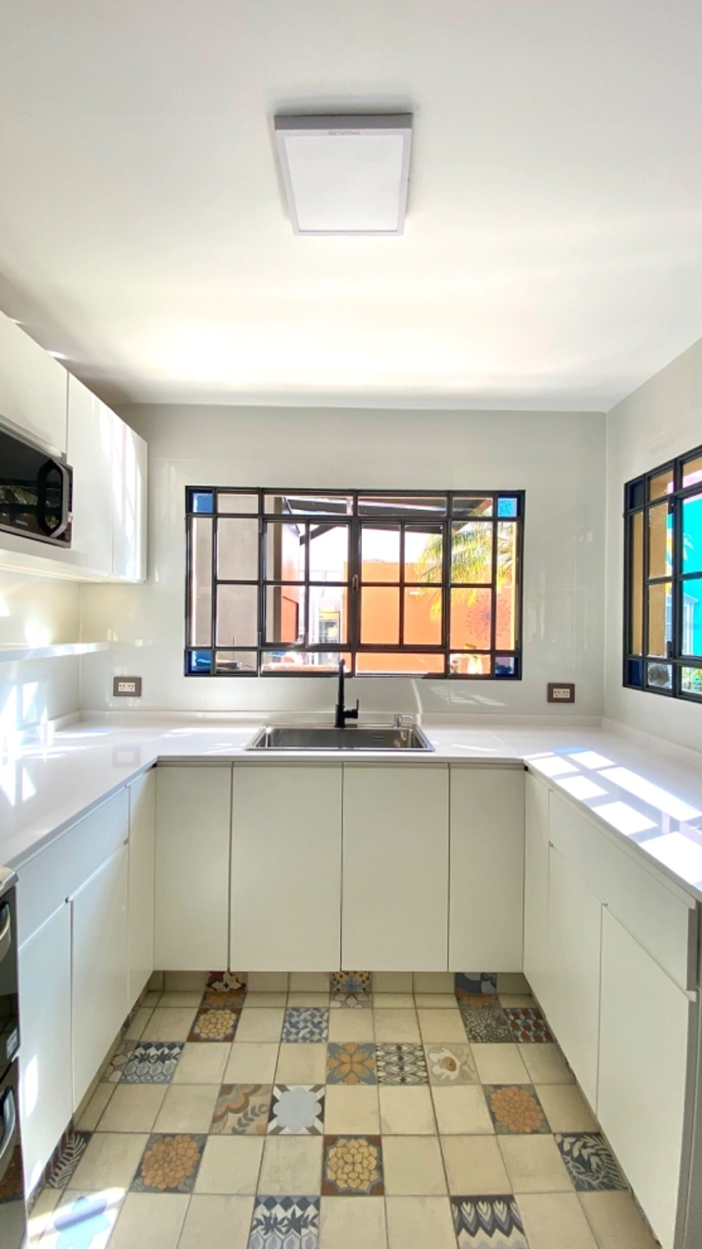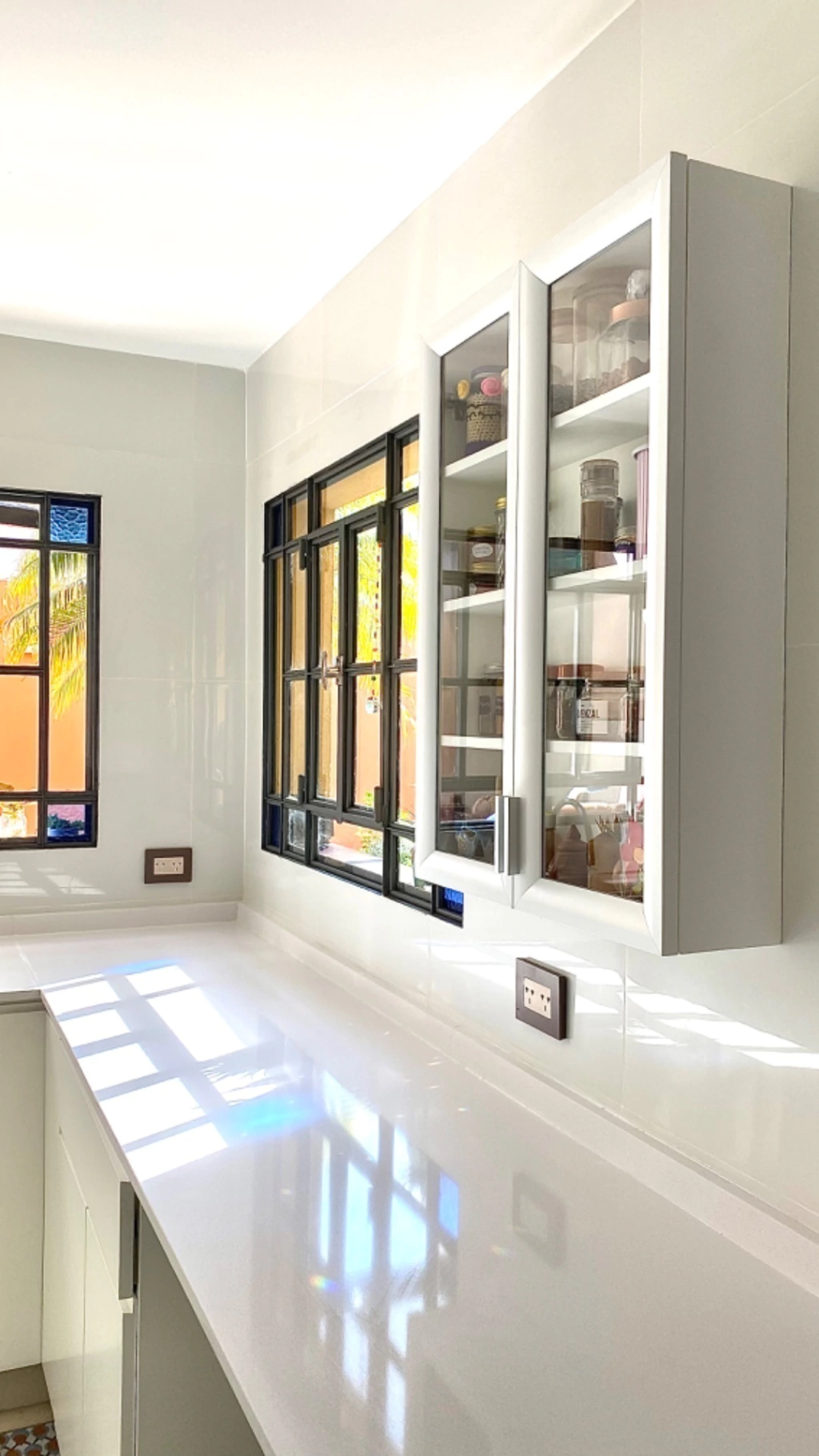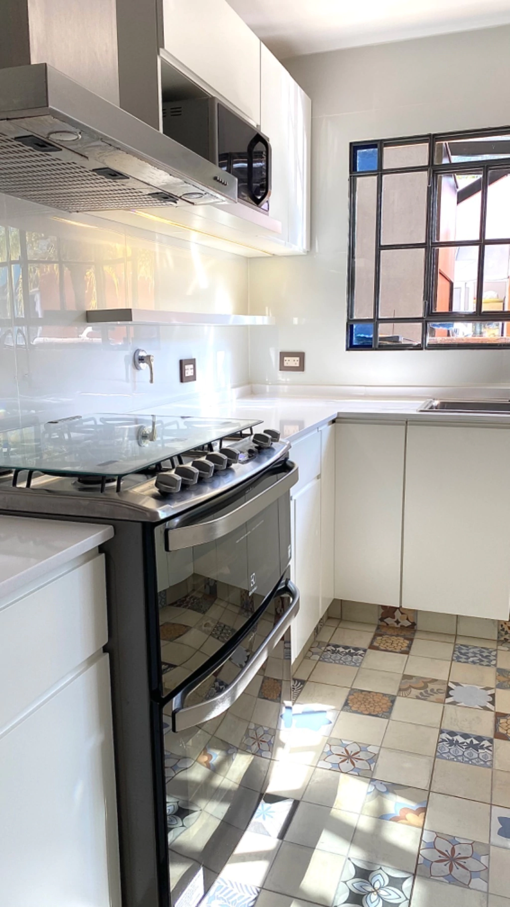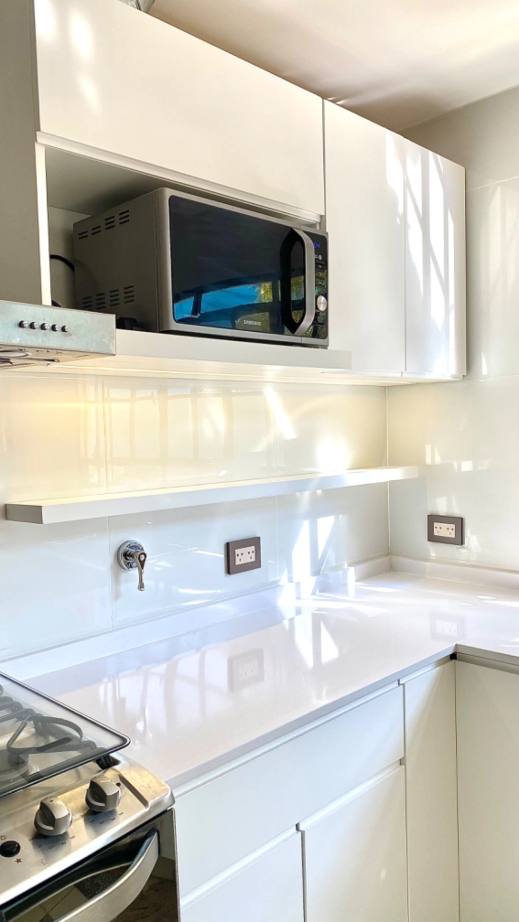 Cocina laqueada poliuretánica blanca con mesada en silestone blanco Zeus